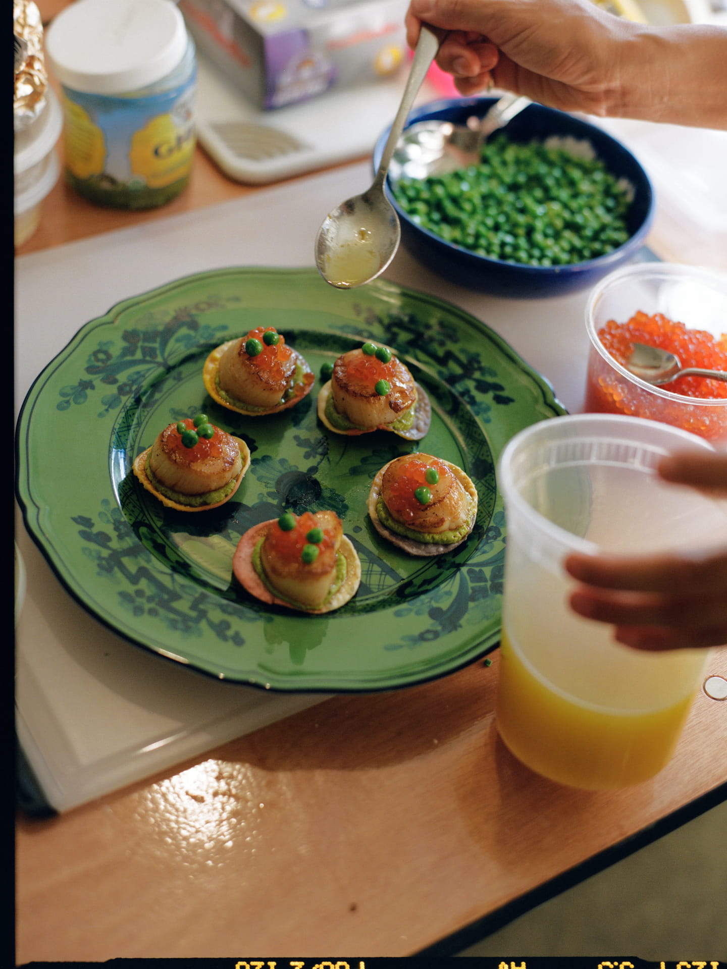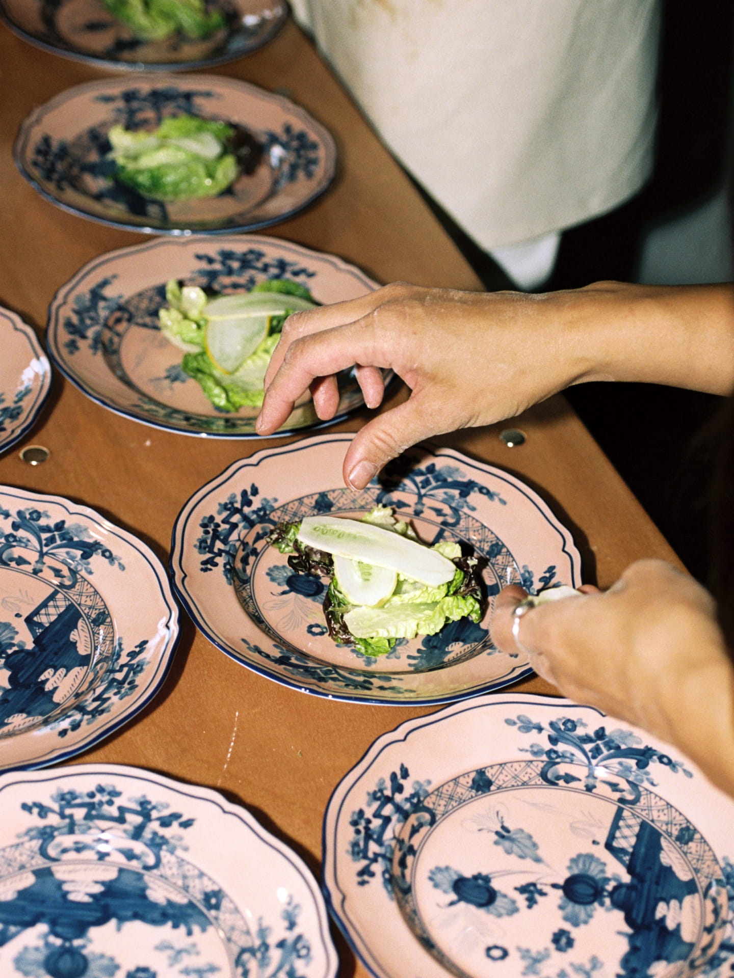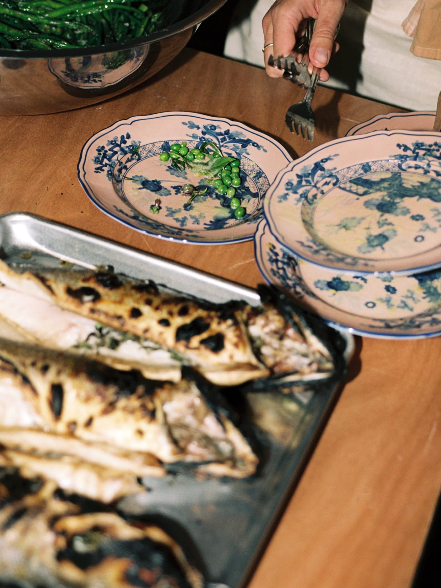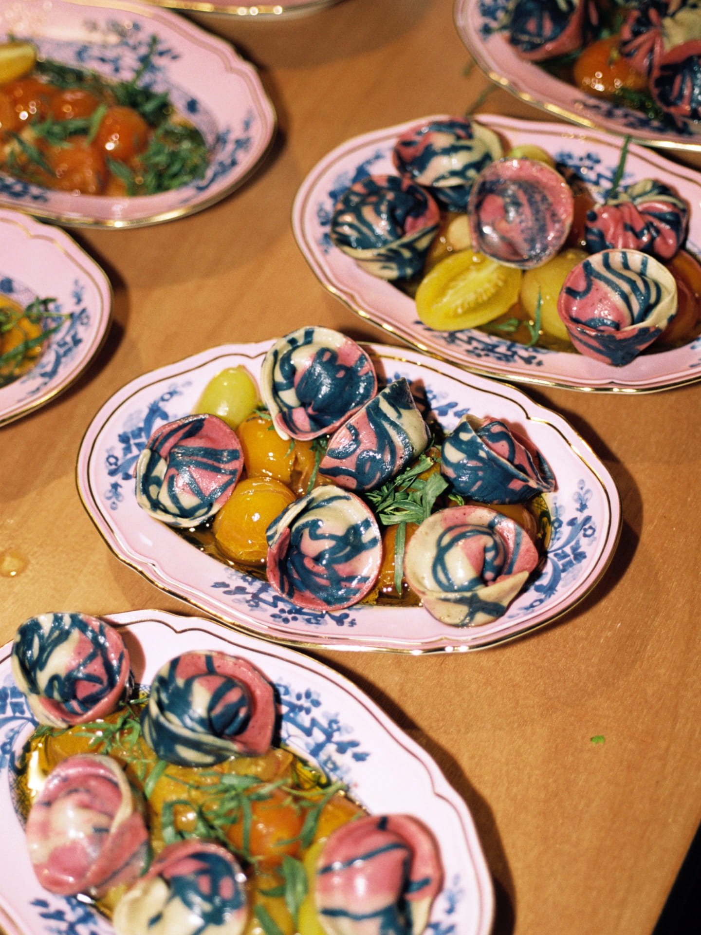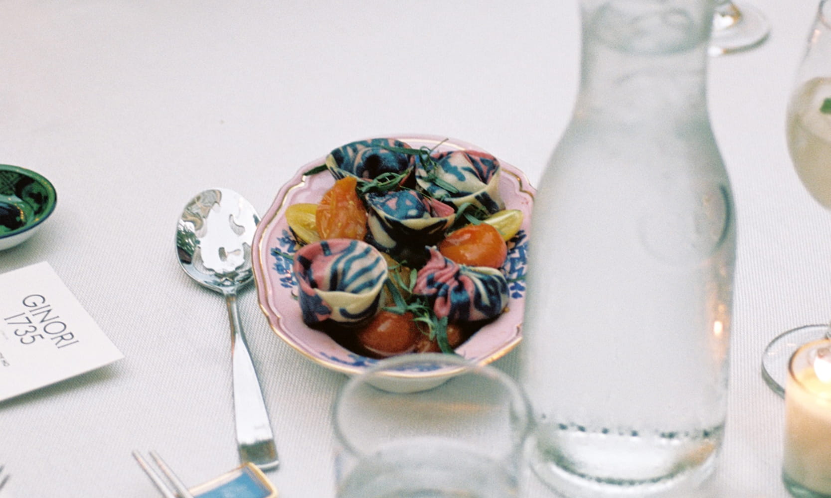 Our evening in the home of Eliana Rodriguez began with passed appetisers followed by shared family style dishes plated on the new collection. Each dish sat on mismatched colours along the table which added to the exuberance of the evening. The menu reflected South East Asian flavours accenting classic Italian fare. We served Rainbow dumplings over confit tomato and garlic sauce, Fire Roasted Branzino with red curry and basil oil. The night finished with a decadent plated Eton Mess topped with bright raspberry powder, rosewater boba, blackberries, sour cherries and vanilla custard.